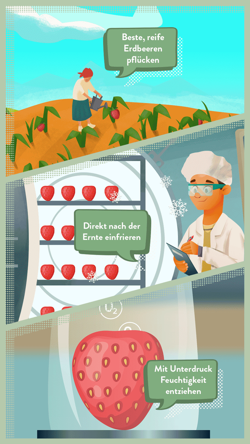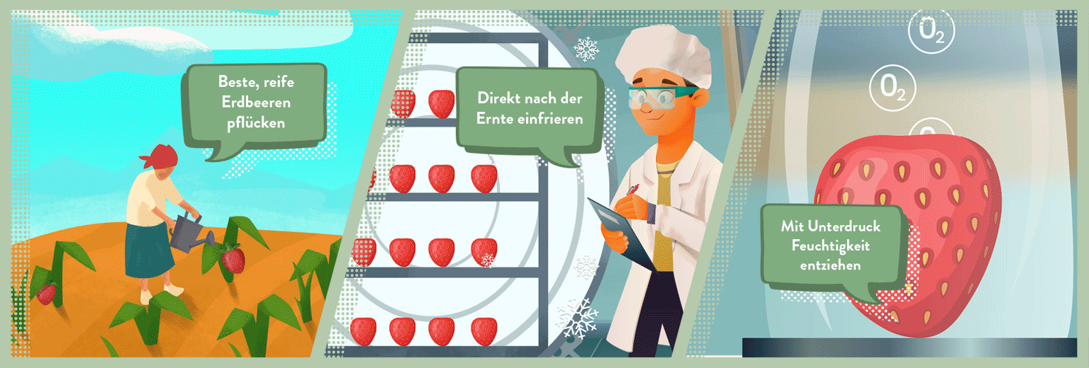 Het bevroren fruit wordt vervolgens in plakjes gesneden of direct in een vacuümkamer geplaatst. Hier wordt bijna al het vocht verwijderd. Dit milde proces behoudt een maximum aan vitaminen en voedingsstoffen. Nu zijn de knapperige, populaire snacks klaar in hun beste rauwe kwaliteit.