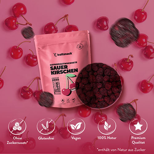 Als je van iets bijzonders houdt, zul je dol zijn op onze gevriesdroogde zure kersen van Kultsnack. Hun fruitig-zure smaak is intens, natuurlijk en ongelooflijk aromatisch – volledig zonder toegevoegde suiker of kunstmatige smaakstoffen, 100% fruit, 100% natuurlijk. Dankzij een proces dat oorspronkelijk is ontwikkeld voor NASA's Mercury-missie, blijven de waardevolle vitamines A, B1, B2, C en E, evenals kalium, foliumzuur en natuurlijke anthocyanen – de kleine, roodpaarse krachtpatsers die kersen hun levendige kleur geven – behouden. Hun knapperige, luchtige textuur met extra crunch maakt ze de perfecte traktatie – of het nu in muesli is, bij pannenkoeken of wafels, in vruchtenthee, ijs of gewoon zo. Een vrucht die je opvrolijkt en je de hele dag gezond houdt.