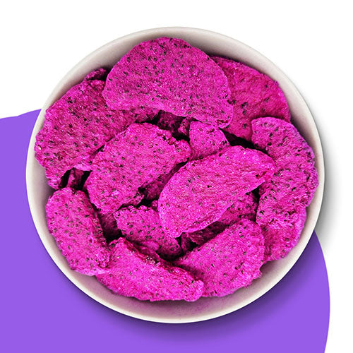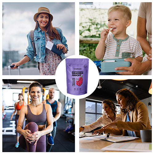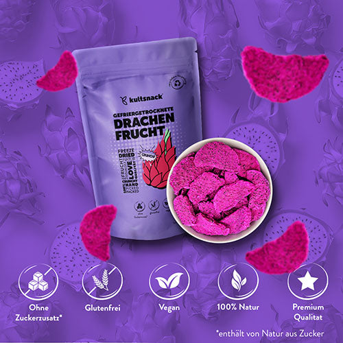 Een vleugje exotisme voor je dag – met onze gevriesdroogde drakenfruit van Kultsnack wordt elk moment een ware smaaksensatie. Het smaakt als een delicate mix van ananas, mango en aardbei – fruitig, lichtzoet en gewoonweg buitengewoon. Volledig natuurlijk, zonder toevoegingen en 100% fruit, barst het van de levendigheid en kleur. Dankzij het voorzichtige vriesdrogen blijft het extra knapperig en behoudt het zijn waardevolle vitaminen, antioxidanten en voedingsstoffen. De extra grote stukken en plakjes zijn van de hoogste kwaliteit en geven je een ware energieboost – met bètacaroteen, ijzer, vitamine C en meer. Of het nu in muesli, yoghurt of een smoothie is – deze drakenfruit is een heerlijke, gemakkelijke en hoogwaardige toevoeging aan een natuurlijk vers ontbijt en een kleurrijke start van de dag.